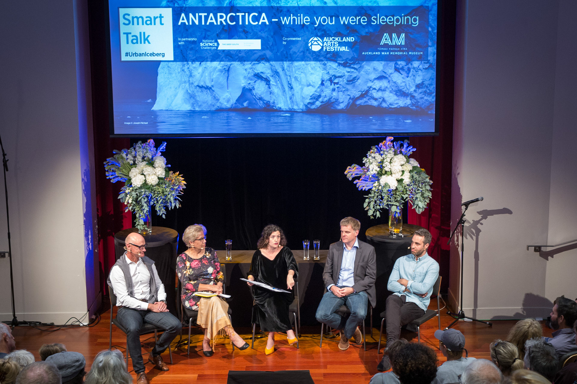 The Antarctica while you were sleeping installation (part of the 2017 Auckland Arts Festival) provided the opportunity to raise the profile of both Antarctica and climate change to Auckland audiences. The Deep South Challenge and Radio New Zealand held an interactive discussion at the Auckland Museum hosted by Noelle McCarthy. Multimedia artist Joseph Michael, oceanographer Dr Mike Williams, Associate Professor Sandy Morrison and entrepreneur Geoff Ross discussed the impact of Antarctica on the planet, and explored how to work together effectively to both reduce and adapt to climate change.